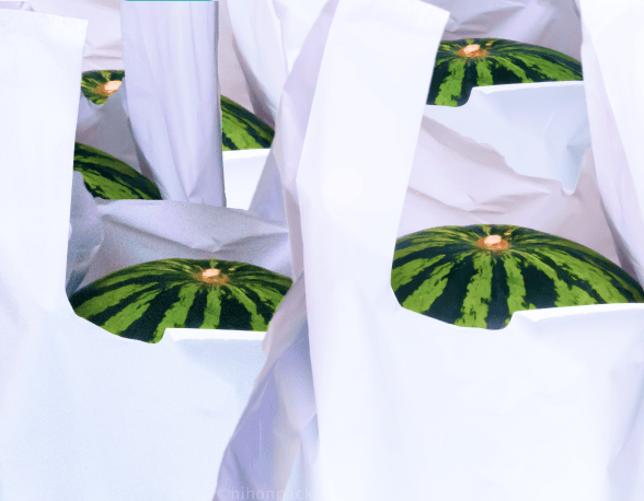 当時(昭和55年)、スイカの網は国内で1~2社しかセロファン製の網を作っておらず、便利だとは判っていても単価が高く、予算の都合上スイカ1個に網を一つつけて販売する事はなかなかむつかしいこと…………